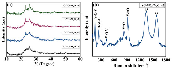 (a) XRD spectra of all the composite and (b) Raman spectra of rG-VO2/W5O14-2 composite.
