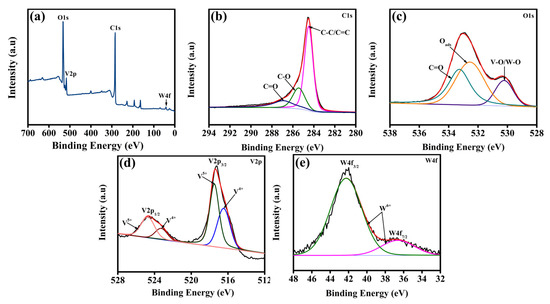 (a) XPS survey spectra, high resolution XPS spectra of (b) C1s, (c) O1s, (d) V2p, and (e) W4f of rG-VO2/W5O14-2 composite.