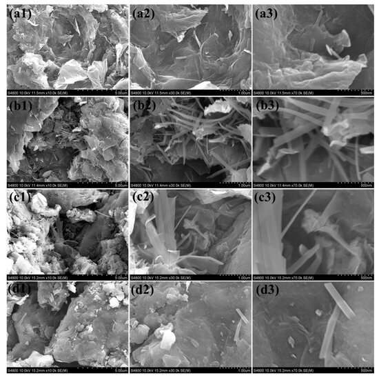 SEM micrograph images of (a1–a3) rG-VO2/W5O14-1, (b1–b3) rG-VO2/W5O14-2, (c1–c3) rG-VO2/W5O14-3, and (d1–d3) rG-VO2/W5O14-4 electrocatalyst.
