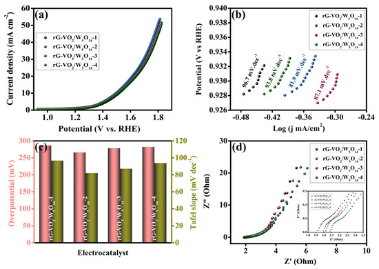 To systematically evaluate the oxygen evolution reaction performance of the synthesized electrocatalysts, electrochemical measurements were carried out in a standard three-electrode configuration using 1 M KOH aqueous electrolyte. The LSV was employed to determine the overpotential (η), a key indicator of catalytic activity, with a scan rate of 5 mV s−1 and iR compensation applied to all measurements. The LSV profiles of the rG-VO2/W5O14 composites namely rG-VO2/W5O14-1, rG-VO2/W5O14-2, rG-VO2/W5O14-3, and rG-VO2/W5O14-4 are presented in Figure 6a and data presented in Figure 6c. Among them, the rG-VO2/W5O14-2 sample exhibited the most remarkable OER activity, achieving a low overpotential of 265.8 mV at a benchmark current density of 10 mA cm−2. In contrast, higher overpotentials were observed for rG-VO2/W5O14-1 (286.3 mV), rG-VO2/W5O14-3 (278.3 mV), and rG-VO2/W5O14-4 (282.1 mV) indicating inferior electrocatalytic performance under identical conditions. The superior performance of rG-VO2/W5O14-2 can be attributed to the optimized composition and synergistic integration of W5O14 which enhances the density of active sites and facilitates faster electron transfer. This trend suggests a direct correlation between W5O14 concentration in the hybrid material and OER efficiency. To further elucidate the reaction kinetics, Tafel slope analysis was conducted, as shown in Figure 6b,c. The rG-VO2/W5O14-2 catalyst recorded the lowest Tafel slope of 81.9 mV dec−1, reflecting more favorable charge transfer kinetics. This value was lower than those obtained for rG-VO2/W5O14-1 (96.7 mV dec−1), rG-VO2/W5O14-3 (87.1 mV dec−1), and rG-VO2/W5O14-4 (93.8 mV dec−1), confirming the enhanced intrinsic electrocatalytic activity of rG-VO2/W5O14-2. Electrochemical impedance spectroscopy (EIS) was employed to investigate the charge transfer properties and interfacial resistance of the catalysts during OER. The Nyquist plots displayed in Figure 6d reveal that rG-VO2/W5O14-2 exhibits the smallest semicircle diameter, signifying reduced charge transfer resistance (Rct) and accelerated interfacial electron transport. This behavior is further supported by the inset of Figure 6d, where the real impedance (Zre) trends toward lower values. The extracted Rct values for rG-VO2/W5O14-1, rG-VO2/W5O14-2, rG-VO2/W5O14-3, and rG-VO2/W5O14-4 were 0.16, 0.12, 0.13, and 0.14 Ω, respectively. The notable decrease in Rct for rG-VO2/W5O14-2 underscores its superior electrochemical performance, which is primarily attributed to enhanced conductivity and the presence of abundant surface-active sites facilitated by the rGO-VO2/W5O14 integration. This synergistic effect promotes efficient electron transport pathways and increases the rate of oxygen evolution, making rG-VO2/W5O14-2 a promising electrocatalyst for OER applications.