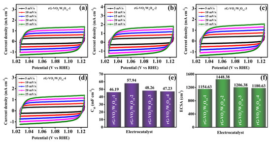Cyclic voltammetry analysis at different scan rate (a) rG-VO2/W5O14-1, (b) rG-VO2/W5O14-2, (c) rG-VO2/W5O14-3, and (d) rG-VO2/W5O14-4, (e) Cdl graph, and (f) ECSA graph of all the electrocatalysts.