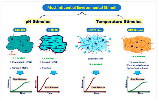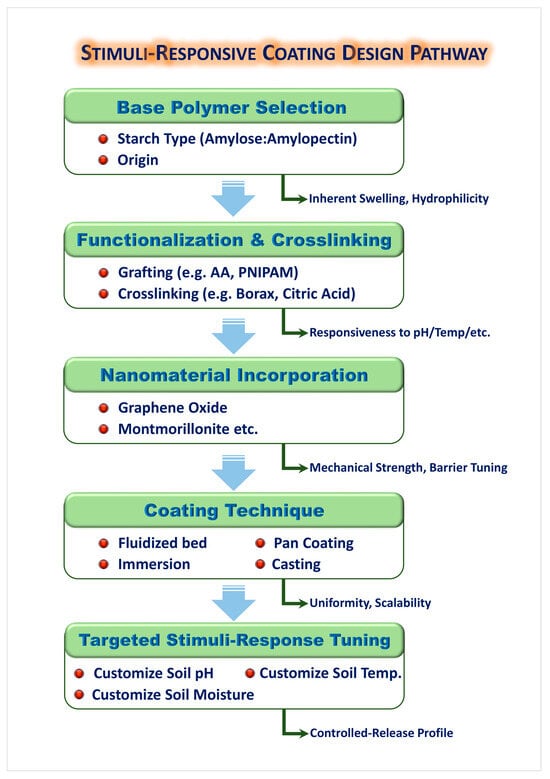 - By bridging materials science, agronomy, and environmental engineering, starch-based stimuli-responsive coatings can deliver context-specific benefits, for example, moisture-responsive hydrogels that swell during storm events and de-swell as soils dry to buffer rain-pulse leaching in rain-fed/semi-arid systems (see Section 3.3.3), and ionic-strength/pH-responsive matrices that maintain agronomically useful release profiles in alkaline–calcareous soils where Ca2+/Mg2+ and high salinity otherwise complicate nutrient management (see Section 3.3.1 and Section 3.3.6).