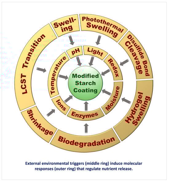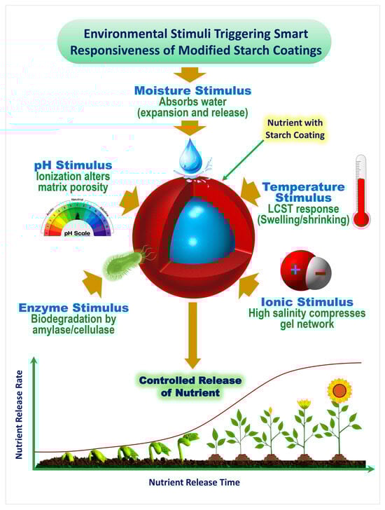 Azeem, B. Stimuli-Responsive Starch-Based Biopolymer Coatings for Smart and Sustainable Fertilizers. Gels 2025, 11, 681. https://doi.org/10.3390/gels11090681