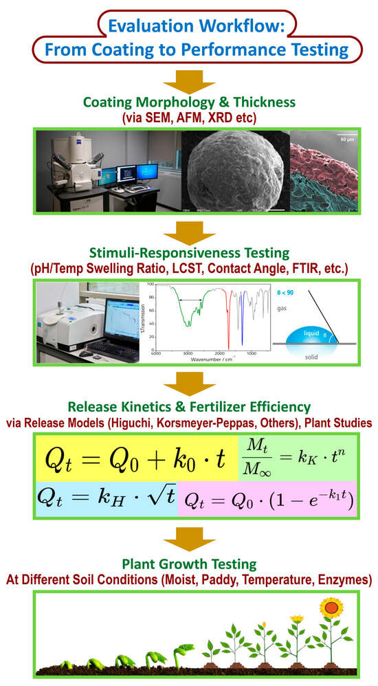 | [105] | Cassava starch-g-poly(acrylic acid)/natural rubber/PVA semi-IPN hydrogel | pH, temperature, ionic strength | Grafting PAA onto starch, blended with NR and PVA, coated over urea with wax layer | Soil and water; chili plant test | 47.5% release in water (168 h), 38.5% in soil (30 d); best for NR:PVA 9:1 | Korsmeyer–Peppas | Low-cost biodegradable formulation; sustained nutrient release; responsive to environmental triggers; improved chili growth |