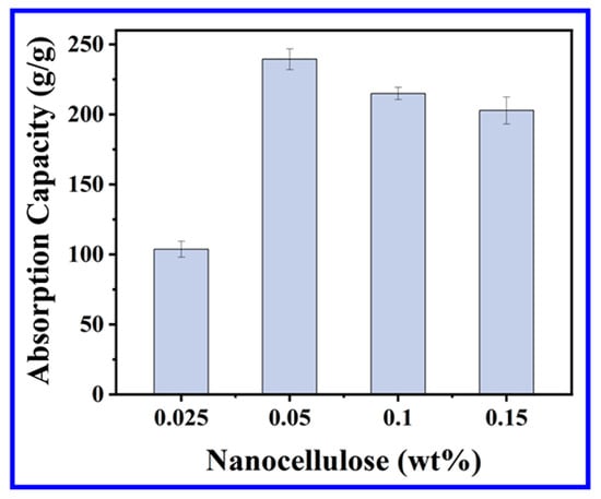 To confirm the optimal synthesis condition of Ag+-MNC aerogels, four sets of samples were synthesized by using NC solutions with weight percentages ranging from 0.025–0.15 wt%. Dichloromethane was selected as the absorbate for evaluation of their absorption capacity. Figure 1 shows the absorption capacities of Ag+-MNC aerogels synthesized from 0.025, 0.05, 0.10, and 0.15 wt% NC solutions to dichloromethane, which are 103.73 ± 5.76, 239.40 ± 7.41, 214.94 ± 4.37, and 202.81 ± 9.62 g/g, respectively. Therefore, 0.05 wt% of NC solution is the optimal NC concentration for the synthesis of Ag+-MNC aerogels. We have found that the Ag+-MNC aerogels prepared with different Ag+ concentrations exhibit the various optimal absorption capacities to different oils and organic solvents, so we have decided to discuss it in detail in the following section on absorption capacity.