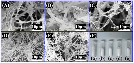 SEM images of Ag+-MNC aerogels with concentration of Ag+ of (A) 20 mmol/L, (B) 25 mmol/L, (C) 30 mmol/L, (D) NC aerogels, (E) Ag+-MA aerogels, (F) Digital photo of (a) NC aerogels, Ag+-MNC aerogels with concentration of Ag+ (b) 20 mmol/L, (c) 25 mmol/L, (d) 30 mmol/L, (e) Ag+-MA aerogels.
