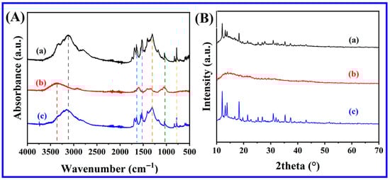 (A) FTIR spectra and (B) XRD patterns of (a) Ag+-MA aerogels, (b) NC aerogels, (c) Ag+-MNC aerogels. Dash lines in (A) represent corresponding characteristic peaks.