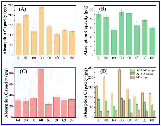 (A) Absorption capacities of Ag+-MNC aerogel, (B) Absorption capacities of Ag+-MA aerogel, (C) Absorption capacities of NC aerogel, and (D) Comparison of absorption capacities of Ag+-MNC aerogel, Ag+-MA aerogel and NC aerogel to (a) acetone, (b) ethyl acetate, (c) cyclohexane, (d) dichloromethane, (e) ethanol, (f) kerosene, (g) pump oil, (h) waste pump oil.