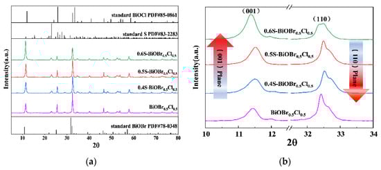 The crystal structure of the xS-BiOBr0.5Cl0.5 materials was analyzed using X-ray diffraction spectroscopy (XRD), and the results are shown in Figure 1. Due to the partial substitution of Br− with Cl−, the diffraction peaks of BiOBr0.5Cl0.5 were shifted to higher angles relative to those of BiOBr, which indicated that the substitution caused the lattice parameter of BiOBr0.5Cl0.5 to be lower than that of BiOBr. The diffraction peaks of the xS-BiOBr0.5Cl0.5 materials were consistent with those of BiOBr, suggesting that the crystal structure of the materials was consistent with that of BiOBr, although the materials contained sulfur dopants. All of the diffraction peaks in the XRD spectra of the xS-BiOBr0.5Cl0.5 materials were sharp, and there were no impurity peaks in the XRD spectra, demonstrating the good crystallinity and purity of the materials. With an increasing sulfur concentration in the xS-BiOBr0.5Cl0.5 materials, the intensity of the diffraction peak corresponding to the (001) plane increased, while the intensity of the diffraction peak corresponding to the (110) plane gradually decreased, indicating that crystals in the materials gradually grew along the (110) plane with an increasing concentration of sulfur dopants in the materials [].