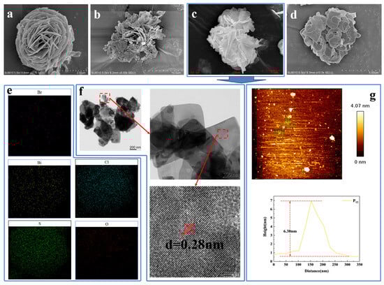 SEM images of BiOBr0.5Cl0.5 (a) and xS-BiOBr0.5Cl0.5 materials (b–d). EDS mapping images of 0.5S-BiOBr0.5Cl0.5 (e). TEM and HRTEM images of 0.5S-BiOBr0.5Cl0.5 (f). The AFM image and the corresponding height-distribution profile of 0.5S-BiOBr0.5Cl0.5 (g).