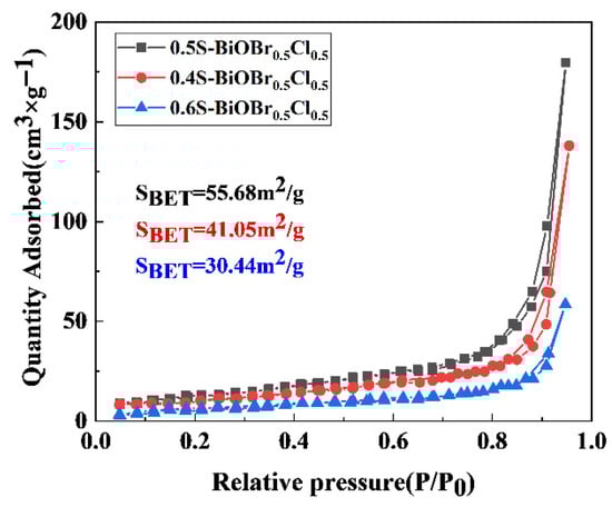 The specific surface areas of the xS-BiOBr0.5Cl0.5 materials were measured through a Brunauer–Emmett–Teller (BET) analysis. As shown in Figure 3, the specific surface areas of 0.4S-BiOBr0.5Cl0.5, 0.5S-BiOBr0.5Cl0.5, and 0.6S-BiOBr0.5Cl0.5 are 41.05 m2/g, 55.68 m2/g, and 30.44 m2/g, respectively. With an increasing concentration of thiourea added to BiOBr0.5Cl0.5, the specific surface areas of the xS-BiOBr0.5Cl0.5 materials increased and then decreased, which was consistent with the SEM results (Figure 2). The addition of thiourea to BiOBr0.5Cl0.5 gradually loosened the flower-like structure of the material, and the three-dimensional flower-like structure of BiOBr0.5Cl0.5 was completely damaged when an excessive amount of thiourea was added to the material, leading to stacking of the nanosheets of the material along the z-axis, a reduction in the specific surface area of the material, an increase in the complexation of photogenerated electrons and holes, and a reduction in the photocatalytic efficiency of the material.