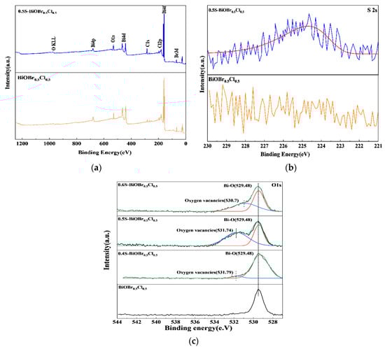 The high-resolution O 1s spectra of xS-BiOBr0.5Cl0.5 materials were deconvoluted into the characteristic peaks of lattice oxygen (529.48 eV) and adsorbed oxygen (530.70 eV).The characteristic peak of adsorbed oxygen was not found in the high-resolution O 1s spectrum of BiOBr0.5Cl0.5 due to the lack of oxygen vacancies on the surface of the material. The lack of oxygen vacancies prevented the effective adsorption of oxygen molecules onto the surface of the material. With the introduction of sulfur into BiOBr0.5Cl0.5, the characteristic peak of adsorbed oxygen appeared in the high-resolution O 1s spectra of xS-BiOBr0.5Cl0.5 materials. The largest area of the adsorbed oxygen peak was observed in the high-resolution O 1s spectrum of 0.5S-BiOBr0.5Cl0.5, proving that the number of oxygen vacancies on the surface of 0.5S-BiOBr0.5Cl0.5 was greater than that on the surfaces of 0.4S-BiOBr0.5Cl0.5 and 0.6S-BiOBr0.5Cl0.5 [,,].