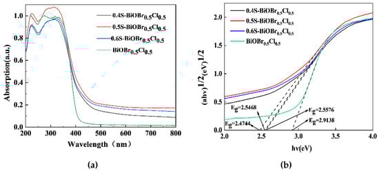 UV–vis absorption spectra (a) and bandgaps (b) of xS-BiOBr0.5Cl0.5 materials.