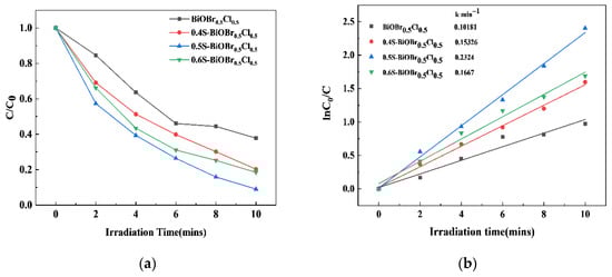 The photocatalytic activity of the xS-BiOBr0.5Cl0.5 materials under visible light irradiation was evaluated using RhB as a contaminant. As depicted in Figure 6a, the RhB degradation efficiency of 0.5S-BiOBr0.5Cl0.5 is greater than that of 0.4S-BiOBr0.5Cl0.5 and 0.6S-BiOBr0.5Cl0.5, reaching 91.06% within 10 min. In comparison, the RhB degradation efficiency of BiOBr0.5Cl0.5 reached 62.23% within 10 min, suggesting that the introduction of oxygen vacancies and sulfur dopants into BiOBr0.5Cl0.5 improved the photocatalytic performance of the resulting xS-BiOBr0.5Cl0.5 materials. The reaction kinetics of the RhB degradation by the xS-BiOBr0.5Cl0.5 materials was described using a pseudo-first-order kinetic model:
