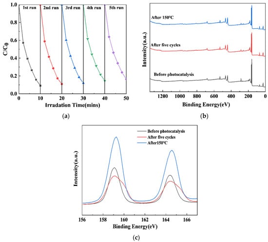 The results of the experiments on the cyclic stability of the xS-BiOBr0.5Cl0.5 materials are shown in Figure 7. The RhB degradation efficiency of 0.5S-BiOBr0.5Cl0.5 reduced from 91.69% in the first cycle to 83.72% by the fifth cycle (Figure 7a), which was due to the loss of the material during collection and purification. Therefore, 0.5S-BiOBr0.5Cl0.5 maintained excellent RhB degradation efficiency for five RhB degradation cycles. The stability of 0.5S-BiOBr0.5Cl0.5 after five RhB degradation cycles and after heating at 150 °C for 1 h under a nitrogen atmosphere was evaluated by measuring the XPS survey spectrum and the high-resolution Bi 4f spectrum of the material. After five RhB degradation cycles or 150 °C heating, no obvious changes were detected in the XPS survey spectrum of the material (Figure 7b), while only the heights of the peaks in the Bi 4f spectrum of the material were altered (Figure 7c), suggesting that there were no changes in the valence states of the surface chemical elements of the material. It can be concluded that 0.5S-BiOBr0.5Cl0.5 is a stable and recyclable photocatalyst with a favorable photocatalytic performance.