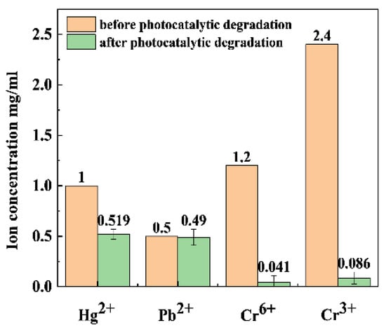 Various chemicals are added to drilling fluids to ensure the stability of the fluids. Unfortunately, many of these chemicals contain heavy-metal ions. At the same time, some of the metal ions in the formation will be dissolved into the drilling fluids, where Hg(II), Pb(II), Cr(VI), and Cr(III) ions are the main heavy-metal ions in the fluids []. In this study, 0.5S-BiOBr0.5Cl0.5 was used to reduce the above heavy-metal ions under visible light irradiation. As shown in Figure 8, the Hg(II), Pb(II), Cr(VI), and Cr(III) reduction efficiencies of 0.5S-BiOBr0.5Cl0.5 are 48.10%, 2.00%, 96.58%, and 96.41%, respectively, demonstrating the good Cr(VI) and Cr(III) reduction efficiencies of the material.