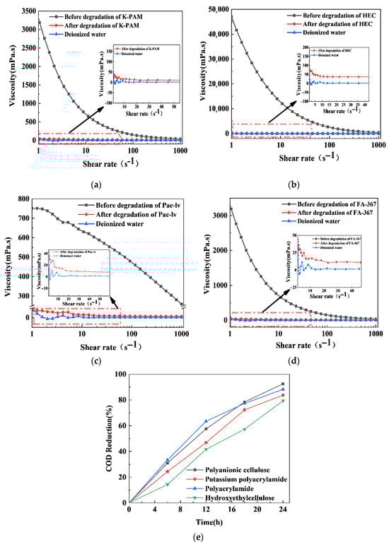 The viscosities of K-PAM (a), HEC (b), PAC-LV (c), and FA-367 (d) solutions measured at different shear rates before and after the photocatalytic degradation of the polymers. Rates of COD reduction in the polymer solutions (e).