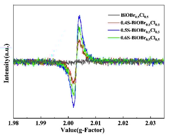 The EPR spectra of the xS-BiOBr0.5Cl0.5 materials (Figure 10) indicated that oxygen vacancies played an important role in the visible-light-driven photocatalytic activity of the materials. The signal at a g-factor = 2.004 indicated electron trapping by the surface oxygen vacancies [,,], and this signal was not detected in the EPR spectrum of BiOBr0.5Cl0.5. In comparison, distinct signals at a g-factor = 2.003 were detected in the EPR spectra of the xS-BiOBr0.5Cl0.5 materials, demonstrating the formation of oxygen vacancies on the surface of the materials []. Among the xS-BiOBr0.5Cl0.5 materials, 0.5S-BiOBr0.5Cl0.5 showed the highest intensity of the signal at a g-factor = 2.003, proving that its surface captured more electrons and contained more oxygen vacancies, which was in line with the XPS results.