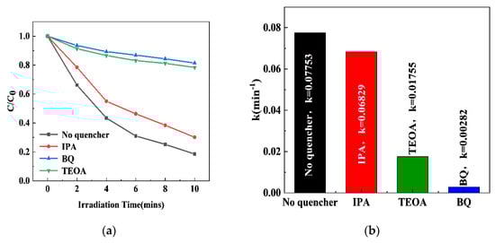 The participation of the above active species in the photocatalytic degradation of RhB by 0.5S-BiOBr0.5Cl0.5 was investigated through active-species-capturing experiments. BQ, IPA, and TEOA were used as the capturing agents for O2−, ·OH, and h+, respectively [], and the effects of the capturing agents on the efficiency and apparent rate constant for the degradation of RhB by 0.5S-BiOBr0.5Cl0.5 were investigated. As shown in Figure 11a, compared with the RhB degradation efficiency of 0.5S-BiOBr0.5Cl0.5 in the absence of the capturing agents, the RhB degradation efficiencies of the material in the presence of BQ, IPA, and TEOA decrease by 62.96%, 11.65%, and 59.87%, respectively. The apparent rate constants for the degradation of RhB by 0.5S-BiOBr0.5Cl0.5 in the presence of BQ, IPA, and TEOA were 0.00282/min, 0.06829/min, and 0.01755/min, respectively (Figure 11b), suggesting that O2·− and h+ were the main active species in the photocatalytic degradation of RhB by 0.5S-BiOBr0.5Cl0.5, with ·OH having a low contribution to the photocatalytic degradation of RhB.