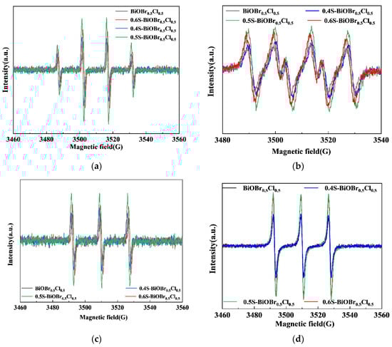 DMPO–·OH (a), DMPO–O2·− (b), DMPO–h+ (c), and DMPO–1O2 (d) EPR spectra for BiOBr0.5Cl0.5 and xS-BiOBr0.5Cl0.5 materials.