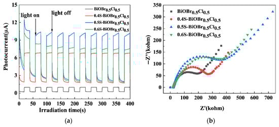 Measurement of the TPC responses and electrochemical impedance is a direct method for verifying the efficiency of charge carrier separation in a photocatalyst. Under dark conditions, neither the BiOBr0.5Cl0.5 or xS-BiOBr0.5Cl0.5 material generated any TPC response (Figure 13a). On the other hand, under visible light irradiation, the photocurrent intensity of the xS-BiOBr0.5Cl0.5 materials gradually increased with an increasing concentration of sulfur dopants in the materials, with 0.5S-BiOBr0.5Cl0.5 exhibiting the highest photocurrent intensity among the materials, implying that the presence of sulfur dopants and oxygen vacancies in 0.5S-BiOBr0.5Cl0.5 enabled the material to prevent e−–h+ complexation and accelerate the charge transfer []. The Nyquist plots of the BiOBr0.5Cl0.5 and xS-BiOBr0.5Cl0.5 materials, which were obtained through an electrochemical impedance spectroscopy (EIS) analysis, are shown in Figure 13b. The smaller the radius of the arc in the Nyquist plot of a sample (BiOBr0.5Cl0.5, 0.4S-BiOBr0.5Cl0.5, 0.5S-BiOBr0.5Cl0.5, or 0.6S-BiOBr0.5Cl0.5), the better the sample hindered the complexation of photogenerated charge carriers, and the higher the photocatalytic efficiency of the sample. Compared with the Nyquist plot for BiOBr0.5Cl0.5, those for the xS-BiOBr0.5Cl0.5 materials showed smaller arc radii, with the Nyquist plot for 0.5S-BiOBr0.5Cl0.5 showing the smallest arc radius, suggesting that 0.5S-BiOBr0.5Cl0.5 had the lowest electron transfer resistance and the highest photocatalytic efficiency among the materials.