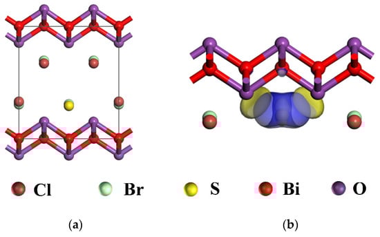 DFT-based first-principles electronic structure calculations were performed on the electron-cloud structure of 0.5S-BiOBr0.5Cl0.5. The model for a cell of BiOBr0.5Cl0.5 was constructed using the following structural parameters: a = b = 3.891 Å, c = 8.092 Å, α = β = γ = 90°, and V0 = 11.08 Å. As shown in Figure 14a, the cell of BiOBr0.5Cl0.5 is a 2 × 1 × 1 cell containing 12 atoms, with sulfur atoms substituting the chloride atoms at the center of the cell. On the basis of the model constructed for the BiOBr0.5Cl0.5 cell, the distribution of the interlayer charges was analyzed through DFT-based first-principles calculations. A high charge density was formed between [Bi2O2]2+ and the atomic-sulfur layers (Figure 14b) due to the above substitution of chloride atoms with sulfur atoms (the electronegativity of the sulfur atoms was lower than that of the chloride atoms). The strong Bi–S bond accumulated electrons on the sulfur atoms and depleted electrons on the bismuth atoms, leading to polarization between the [Bi2O2]2+ and atomic-sulfur layers. This polarization enhanced the internal electric field and acted as a driving force for e−–h+ separation and transport, leading to improved photocatalytic efficiency in 0.5S-BiOBr0.5Cl0.5.