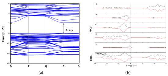The bandgap of 0.5S-BiOBr0.5Cl0.5 calculated through DFT-based first-principles calculation was 2.16 eV (Figure 15a), which was lower than that measured through UV–vis spectroscopy (2.47 eV). The difference between the calculated and measured bandgaps was due to the limitation of GGA-PBE, but this limitation did not affect the calculated results for the 0.5S-BiOBr0.5Cl0.5 electronic structure. The effective mass and mobility of charge carriers are directly related to the curvature of the energy-band structure, and the energy-band structure of 0.5S-BiOBr0.5Cl0.5 showed highly dispersed electronic energy levels at the bottom of the conduction band of the material, indicating that the material had a high charge carrier separation capacity and many photogenerated e− that could participate in a photocatalytic reaction. Total density of states (TDOS) and partial density of states (PDOS) maps of 0.5S-BiOBr0.5Cl0.5 are shown in Figure 15b. The top of the valence band of 0.5S-BiOBr0.5Cl0.5 was dominated by the S 2p state, which caused it to span across the Fermi energy level without inducing any change to the bottom of the conduction band of the material. On the other hand, the bottom of the conduction band of 0.5S-BiOBr0.5Cl0.5 was dominated by the Bi 6p state. Therefore, it was inferred that e− jumped from the S 2p hybridized orbitals at the top of the valence band of 0.5S-BiOBr0.5Cl0.5 to the unoccupied Bi 6p orbitals at the bottom of the conduction band of the material, improving the visible light response of the material.