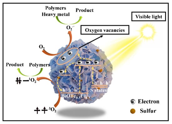 The photocatalytic mechanism of 0.5S-BiOBr0.5Cl0.5 is shown in Figure 16. BiOBr0.5Cl0.5 reacted with thiourea to generate abundant oxygen vacancies on the surface of 0.5S-BiOBr0.5Cl0.5. The oxygen vacancies not only captured photogenerated e− but also facilitated the generation of active species (1O2 and O2−) on the surface of the material. Although the conduction-band position of 0.5S-BiOBr0.5Cl0.5 was similar to that of BiOBr0.5Cl0.5, the valence-band position of 0.5S-BiOBr0.5Cl0.5 was elevated relative to that of BiOBr0.5Cl0.5, which reduced the bandgap of 0.5S-BiOBr0.5Cl0.5 and improved the visible light response of the material. Moreover, the presence of sulfur dopants enhanced the internal electric field of 0.5S-BiOBr0.5Cl0.5, hindering the complexation of photogenerated e− and h+. It was concluded that the high photocatalytic activity of 0.5S-BiOBr0.5Cl0.5 was contributed by the synergistic effect of multiple factors.