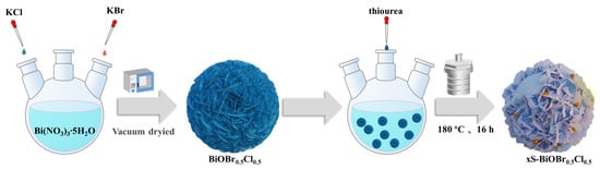 The synthesis method of xS-BiOBr0.5Cl0.5 is shown in Figure 17. Bi(NO3)3·5H2O (3 mmol) and deionized water (50 mL) were added to a 100 mL three-necked round-bottom flask, and the mixture was stirred at 2000 rpm to form a Bi(NO3)3 solution. Nitrogen was injected to remove trapped air and maintain an anaerobic environment. Separately, 1.5 mmol of KBr and 1.5 mmol of KCl were dissolved in 20 mL of deionized water, and the resulting solution was slowly dripped into the Bi(NO3)3 solution using a 20 mL syringe. The mixture was stirred at 2000 rpm for 30 min and filtered, and the solid product was washed three times with deionized water and ethanol, followed by vacuum-drying at 60 °C for 12 h to obtain 3D flower-like BiOBr0.5Cl0.5. For the sulfur-doped materials, BiOBr0.5Cl0.5 (1 mmol) was dispersed in 20 mL of deionized water in a three-necked flask, stirred at 2000 rpm for 30 min, and purged with nitrogen. A specified amount of thiourea (0.4, 0.5, or 0.6 mmol) was added, and the mixture was transferred into a polytetrafluoroethylene-lined autoclave for hydrothermal treatment at 180 °C for 16 h. After cooling, the product was filtered, washed with deionized water and ethanol, and vacuum-dried at 60 °C for 12 h to yield xS-BiOBr0.5Cl0.5 (x = 0.4, 0.5, or 0.6).