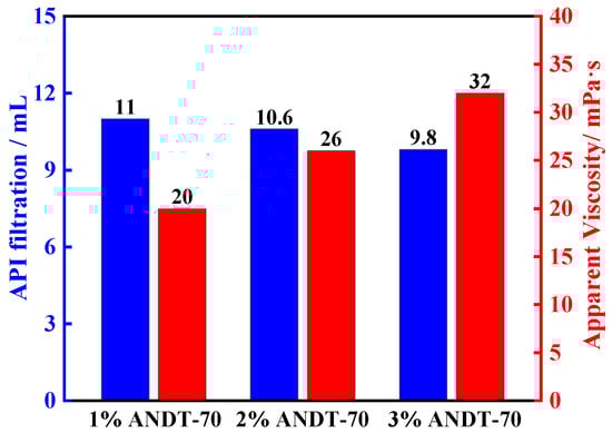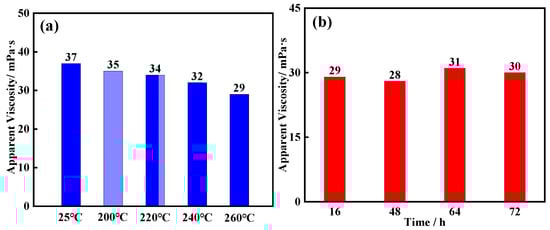 Following the procedure described in Section 4.4, temperature tolerance and long-term thermal stability tests were conducted on a bentonite slurry system modified with the core–shell-structured microgel ANDT-70. The results are shown in Figure 2. As shown in Figure 2a, the viscosity of the system decreases with increasing temperature. However, after aging at 260 °C for 16 h, the system maintains a viscosity of approximately 29 mPa·s, indicating that the high temperature imposes minimal impact on the system, and no significant structural degradation has occurred. Even after continuous hot rolling for 72 h under high-temperature conditions, the viscosity remains relatively stable, maintaining around 29 mPa·s, as illustrated in Figure 2b. Compared to room-temperature conditions, the viscosity retention rate was 81.10%. These findings demonstrate that the core–shell-structured microgel ANDT-70 exhibits excellent thermal tolerance and long-term heat resistance, indicating strong potential for application in extreme high-temperature and high-pressure downhole environments.