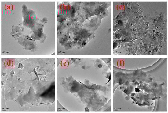 To further investigate the high-temperature performance mechanism of the core–shell-structured microgel ANDT-70, transmission electron microscopy (TEM) was employed to observe the microstructures of bentonite slurry with and without the addition of ANDT-70. As shown in the TEM images, the bentonite slurry exhibited reduced transparency after high-temperature treatment, accompanied by the pronounced aggregation of bentonite lamellae (Figure 4a,b). In contrast, the addition of ANDT-70 significantly enhanced the transparency of the system, indicating that the microgel effectively inhibited the aggregation of bentonite lamellae (Figure 4d,e), which is critical for maintaining high thermal resistance. Additionally, salt ions were introduced into the system to evaluate the effects of salt-induced erosion. A comparison of Figure 4c,f reveals that the introduction of ANDT-70 substantially reduced particle aggregation and effectively protected the bentonite structure from salt-ion-induced degradation. Further validation of the salt resistance of ANDT-70 is provided in Section 2.3 in detail.