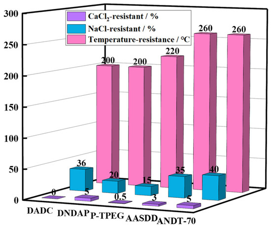 To further evaluate the salt resistance of the core–shell-structured microgel ANDT-70, a comparative analysis was conducted against representative salt-tolerant materials reported in the literature [19,32,33,34], as shown in Figure 5. To ensure fair comparison, the experiments were conducted under the same conditions as reported in the literature and carried out following the procedures described in Section 4.4 of this study. In saturated NaCl systems, the performance of ANDT-70 was similar to that of AASDD, exhibiting superior salt resistance over other materials. In calcium salt environments, ANDT-70 demonstrated a performance similar to that of DNDAP and outperformed the remaining reference materials. In summary, considering the findings in Section 2.2 regarding thermal endurance and long-term stability, ANDT-70 exhibits robust overall stability and application potential under high-temperature, prolonged exposure, and high-salinity conditions.