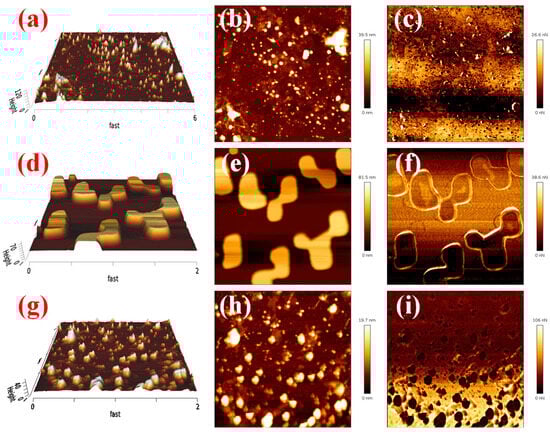 To investigate the relationship between ANDT-70 and drilling fluid performance parameters (American Petroleum Institute (API filtration) and rheology), the performance of bentonite slurry drilling fluids was evaluated at varying ANDT-70 concentrations. The results show that the system viscosity increased with higher ANDT-70 content (Figure 6). Taking into account that excessively high viscosity can negatively affect drilling fluid performance, 2 wt% ANDT-70 was found to achieve optimal fluid properties. To investigate the mechanism by which the core–shell-structured microgel ANDT-70 enhances the salt ion resistance of bentonite slurry, three dispersions were prepared: bentonite slurry with salt ions and ANDT-70, bentonite slurry alone, and bentonite slurry with salt ions. Each sample was diluted to 10−6 for analysis and to ensure that the instrument operates within its measurement range, thereby enhancing methodological transparency and data reliability. The microstructures of these samples were examined using atomic force microscopy (AFM). As shown in Figure 7a,b, the bentonite slurry dispersion exhibited good dispersibility with an average particle height of 39.5 nm. Upon the addition of salt ions, significant aggregation and layer stacking occurred. The average height increased to 81.5 nm (Figure 7c), indicating that salt ion erosion disrupted the bentonite structure and promoted aggregate formation. This suggests that the bentonite slurry system is prone to structural destabilization and aggregation failure under high salinity conditions. However, with the addition of ANDT-70, the average height significantly decreased to 19.7 nm (Figure 7h), indicating improved dispersion and a notable reduction in aggregation risk (Figure 7g). These AFM results confirm that the microgel ANDT-70 effectively enhances the resistance of the bentonite slurry system to salt ion erosion.