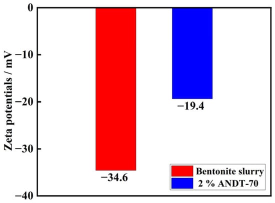 To investigate the mechanism by which the core–shell-structured microgel ANDT-70 affects the adhesion properties of the bentonite slurry system, the Zeta potential of bentonite slurry dispersions before and after ANDT-70 addition was measured. As shown in Figure 8, the Zeta potential of the bentonite slurry dispersion was −34.6 mV, which increased to −19.4 mV upon the addition of microgel ANDT-70. This change indicates that ANDT-70 reduces the negative surface charge density of the system through electrostatic interactions. Moreover, ANDT-70 chemically adsorbs onto the surface of bentonite slurry lamellae and strengthens interlayer adhesion via electrostatic forces and hydrogen bonding. Furthermore, the improved electrostatic stability facilitates the formation and maintenance of the cohesive gel network.