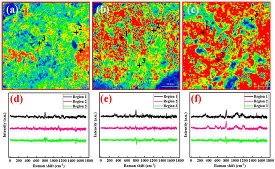 Raman testing of the surface of slices after core displacement experiments with 0.5 wt% concentration of ANDT-70 (a,d), Raman testing of the surface of slices after core displacement experiments with 1.0 wt% concentration of ANDT-70 (b,e), Raman testing of the surface of slices after core displacement experiments with 2.0 wt% concentration of ANDT-70 (c,f), (Three test locations were randomly selected for analysis and marked on the image).