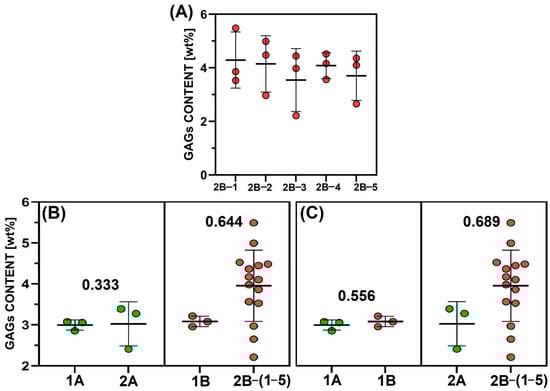 | GAGs (wt%) | 4.29 ± 1.05 | 3.92 ± 0.91 | 3.20 ± 0.62 | 3.35 ± 0.94 | 3.70 ± 0.92 |