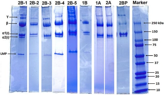 - Veeruraj, A.; Arumugam, M.; Ajithkumar, T.; Balasubramanian, T. Isolation and characterization of collagen from the outer skin of squid (Doryteuthis singhalensis). Food Hydrocoll. 2015, 43, 708–716. [Google Scholar] [CrossRef]