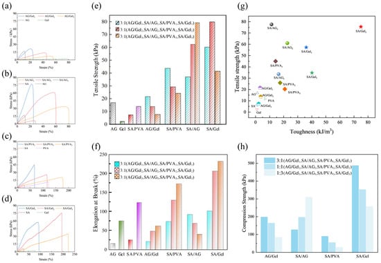 - Wang, L.; Zhang, H.J.; Liu, X.; Liu, Y.; Zhu, X.; Liu, X.; You, X. A physically cross-linked sodium alginate–gelatin hydrogel with high mechanical strength. ACS Appl. Polym. Mater. 2021, 3, 3197–3205. [Google Scholar] [CrossRef]