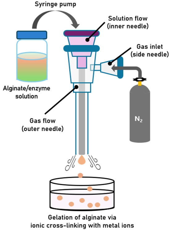 Several techniques have been developed to produce alginate hydrogel microbeads for enzyme entrapment, including emulsion, electrospraying, and spray drying. However, these methods present fundamental limitations because the gelation conditions required for fabricating alginate microbeads are often incompatible with enzyme entrapment, frequently leading to enzyme inactivation. The emulsion method, which disperses an aqueous alginate solution into an oil phase, followed by cross-linking, can generate microbeads of various sizes; however, it often leaves residual surfactants or oils, requires extensive washing, and provides limited size control [15]. Electrospraying enables precise microbead size control in the nano- to microscale range using high-voltage electric fields [16,17]; yet, it typically involves organic solvents that may inactivate enzymes, offers relatively low throughput, and demands complex high-voltage equipment [18]. Spray drying can rapidly produce microbeads by atomizing polymer solutions into heated air streams but is generally unsuitable for heat-sensitive enzymes because of the high temperatures involved [19,20]. In contrast, recently developed gas-shearing is a solvent- and oil-free technique that uses an inert gas (e.g., nitrogen) to apply a shear force to droplets at the nozzle tip, lowering the surface tension and promoting rapid detachment to form uniform microbeads [21]. This method enables continuous production with high throughput, precise control of the microbead size by adjusting the gas flow rate and solution parameters, and minimal post-processing, thereby avoiding conditions that could reduce enzyme activity [22]. In addition, its oil-free nature reduces downstream washing requirements, lowering overall processing costs, and the technique can be scaled by operating multiple units in parallel or integrating into continuous flow systems, highlighting its industrial potential.