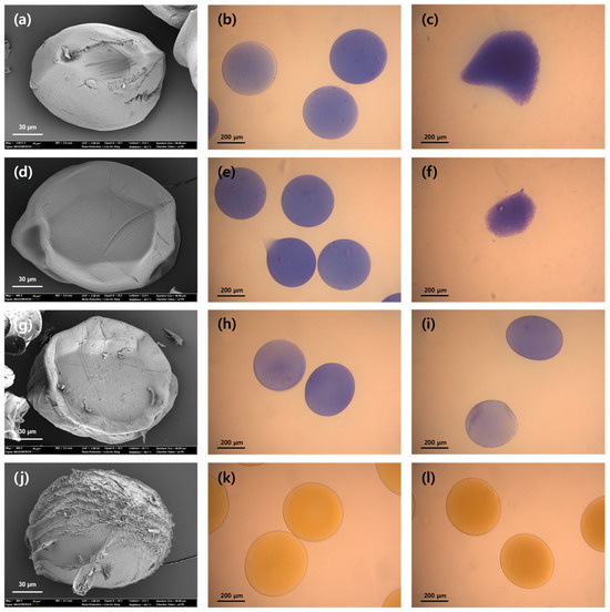 Scanning electron microscopy (left column) and optical microscopy images (middle: initial state, right: after reuse) of CRL-entrapped alginate microbeads cross-linked with different metal ions. (a–c): Ca-alginate microbeads (initial and after 1st reuse), (d–f): Sr-alginate microbeads (initial and after 4th reuse), (g–i): Ba-alginate microbeads (initial and after 4th reuse), (j–l): Fe-alginate microbeads (after 4th reuse). Ca-, Sr-, and Ba-alginate microbeads were stained with methylene blue to visualize their morphology.