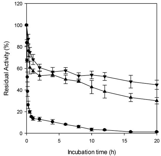 Thermal stability at 60 °C of free CRL (●) and CRL entrapped in Ba-alginate microbeads (▲) and CRL entrapped in Fe-alginate microbeads (▼).