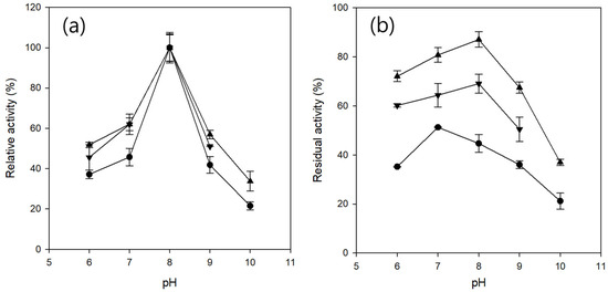pH profile (a) and pH stability (b) at 25 °C of free CRL (●), CRL entrapped in Ba-alginate microbeads (▲), and CRL entrapped in Fe-alginate microbeads (▼). pH profiles were measured using sodium acetate buffer (pH 6), Tris-HCl buffer (pH 7–9), and Glycine-NaOH buffer (pH 10). pH stability was evaluated by measuring the residual activity after 12 h incubation at each pH at 25 °C. Fe-alginate microbeads were excluded at pH 10 due to instability.