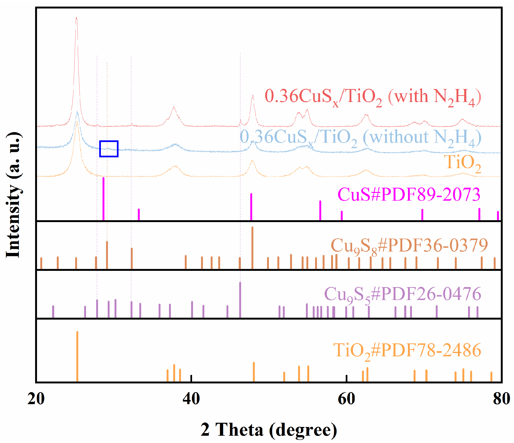 For the 0.36CuSx/TiO2 sample synthesized without hydrazine hydrate, additional diffraction peaks appear at 29.15°, which correspond to the Cu9S8 phase (PDF#36-0379). The main peak at 47.9° overlaps with those of TiO2, suggesting that the TiO2 structure remains largely intact while Cu9S8 is formed. This confirms that the Cu9S8 phase is the dominant copper sulfide species when hydrazine hydrate is not used in the synthesis. In contrast, the 0.36CuSx/TiO2 sample synthesized with hydrazine hydrate shows distinct peaks at 27.9°, 32.4°, and 46.4°, which can be indexed to Cu9S5 (PDF#26-0476). These peaks do not overlap with TiO2, indicating the formation of Cu9S5 and confirming that hydrazine hydrate influences the phase transition from Cu9S8 to Cu9S5. Importantly, no CuS species were observed in any of the samples, highlighting that the formation of Cu9S8 or Cu9S5 is strictly controlled by the presence of hydrazine hydrate under the hydrothermal conditions. These results emphasize the critical role of hydrazine hydrate in modulating the copper sulfide phase in CuSx/TiO2 composites. In the next sections, the samples synthesized with hydrazine hydrate are referred to as Cu9S5/TiO2, while those synthesized without hydrazine hydrate are referred to as Cu9S8/TiO2.