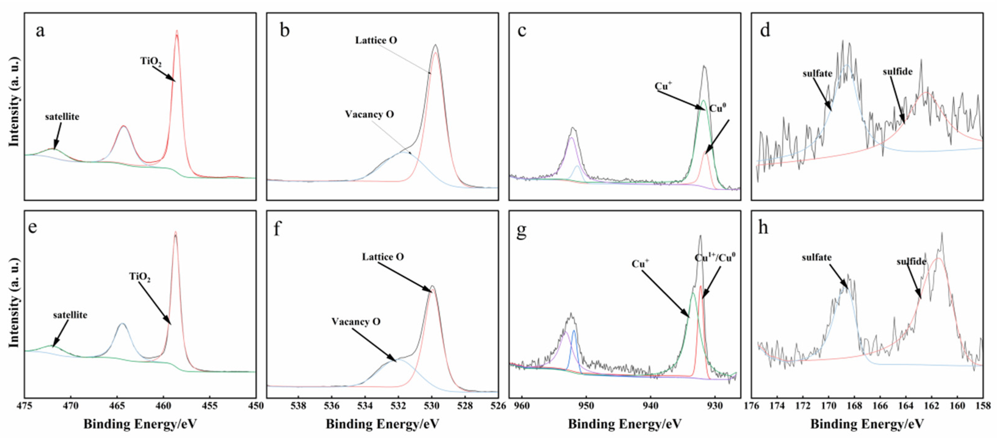 Figure 3. The XPS spectra of Ti 2p, O 1s, Cu 2p, and S 2p regions were analyzed to investigate the chemical environment of titanium, oxygen, copper, and sulfur species, which are crucial for understanding the photocatalytic behavior of these composites. The Ti 2p spectra of both composites exhibited a characteristic binding energy of 458.6 eV, which is typical for TiO