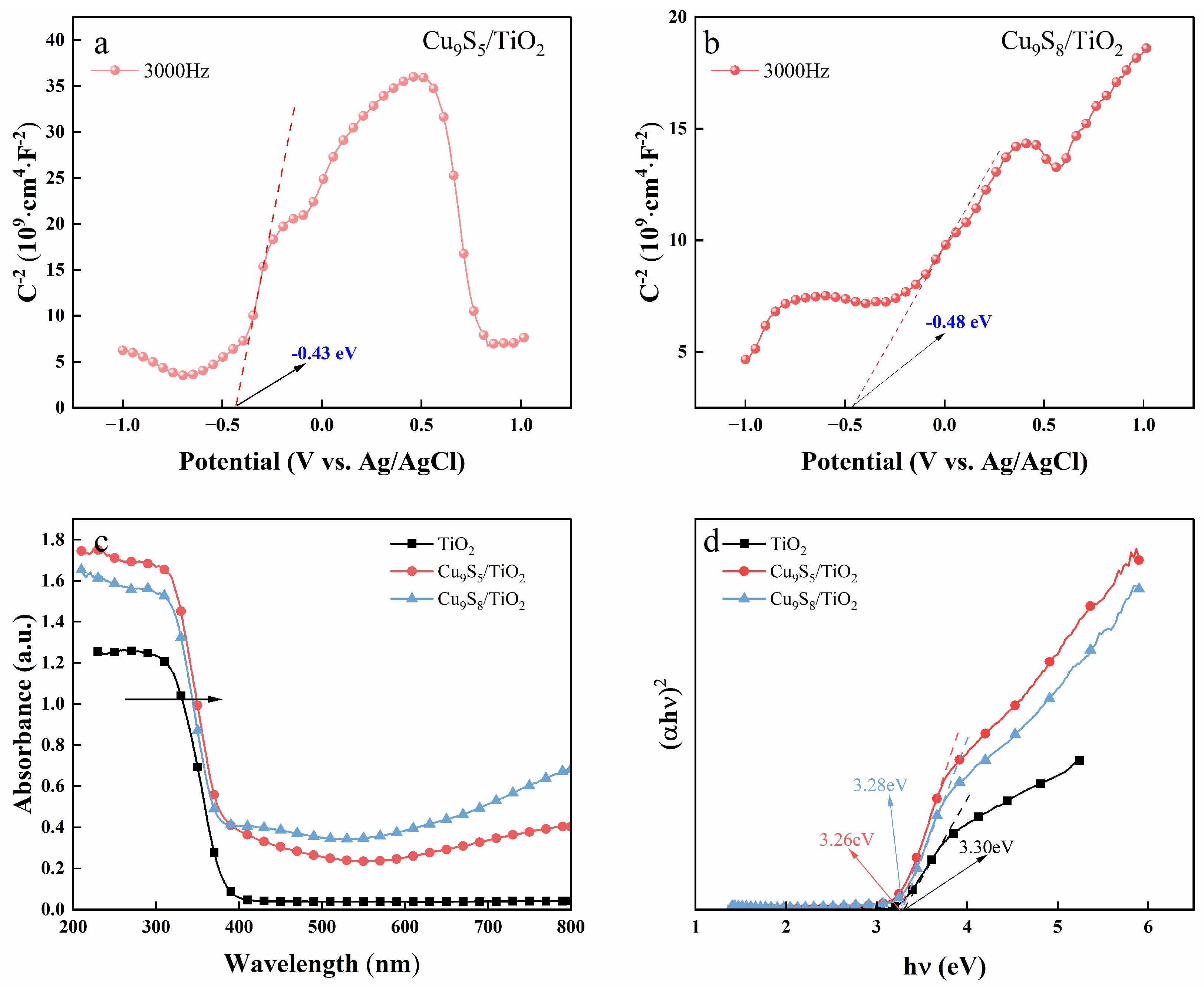Therefore, the results from the Mott–Schottky analysis and UV–vis absorption spectra show that the incorporation of Cu9S5 and Cu9S8 into TiO2 enhances their photocatalytic performance by improving visible light absorption. Cu9S5/TiO2 (3.26 eV) exhibits a smaller band gap than Cu9S8/TiO2 (3.28 eV), which enables better visible light absorption and higher photocatalytic efficiency, making both composites promising candidates for visible-light-driven photocatalysis.