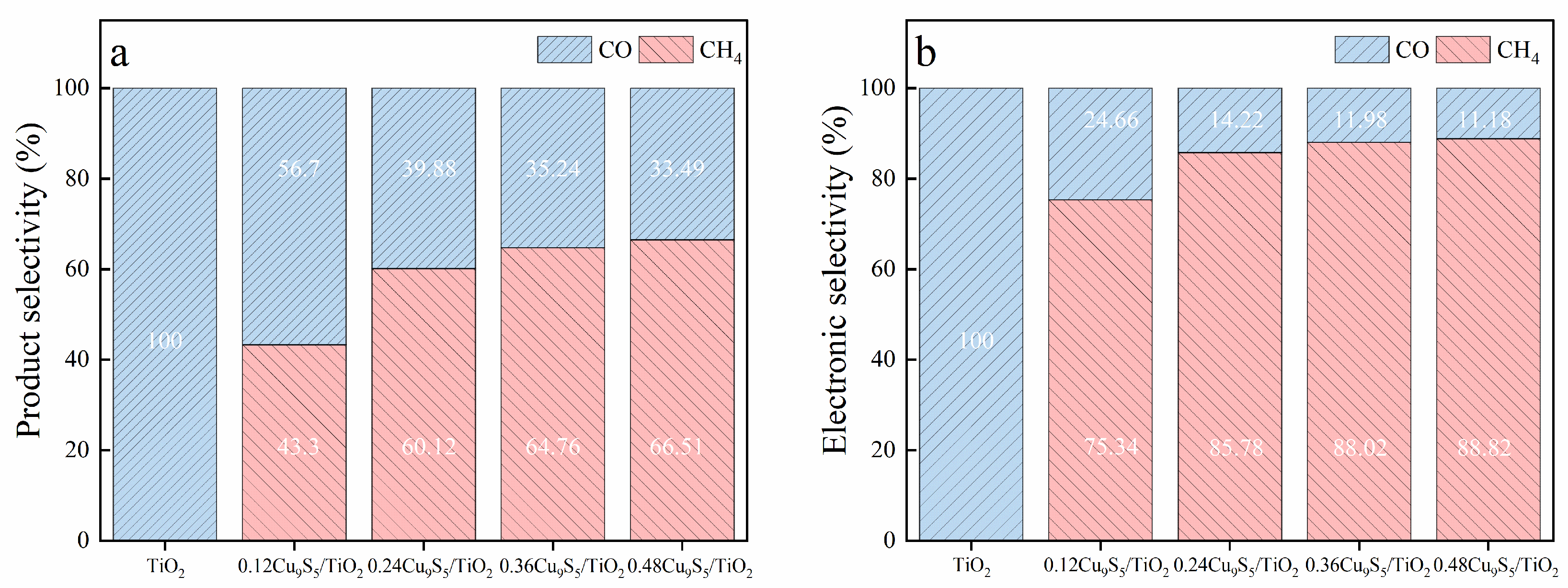 These findings highlight the significant effect of Cu9S5 content on both product selectivity and electronic efficiency in CO2 photoreduction. The 0.36Cu9S5/TiO2 composite achieves the best balance of CH4 and CO selectivity with 64.76% CH4 selectivity and 35.24% CO selectivity, while demonstrating the highest electronic selectivity for CH4 at 88.02%. This makes the 0.36Cu9S5/TiO2 composite a promising photocatalyst for selective CO2 reduction towards methane, offering an efficient electron utilization and favorable product distribution.