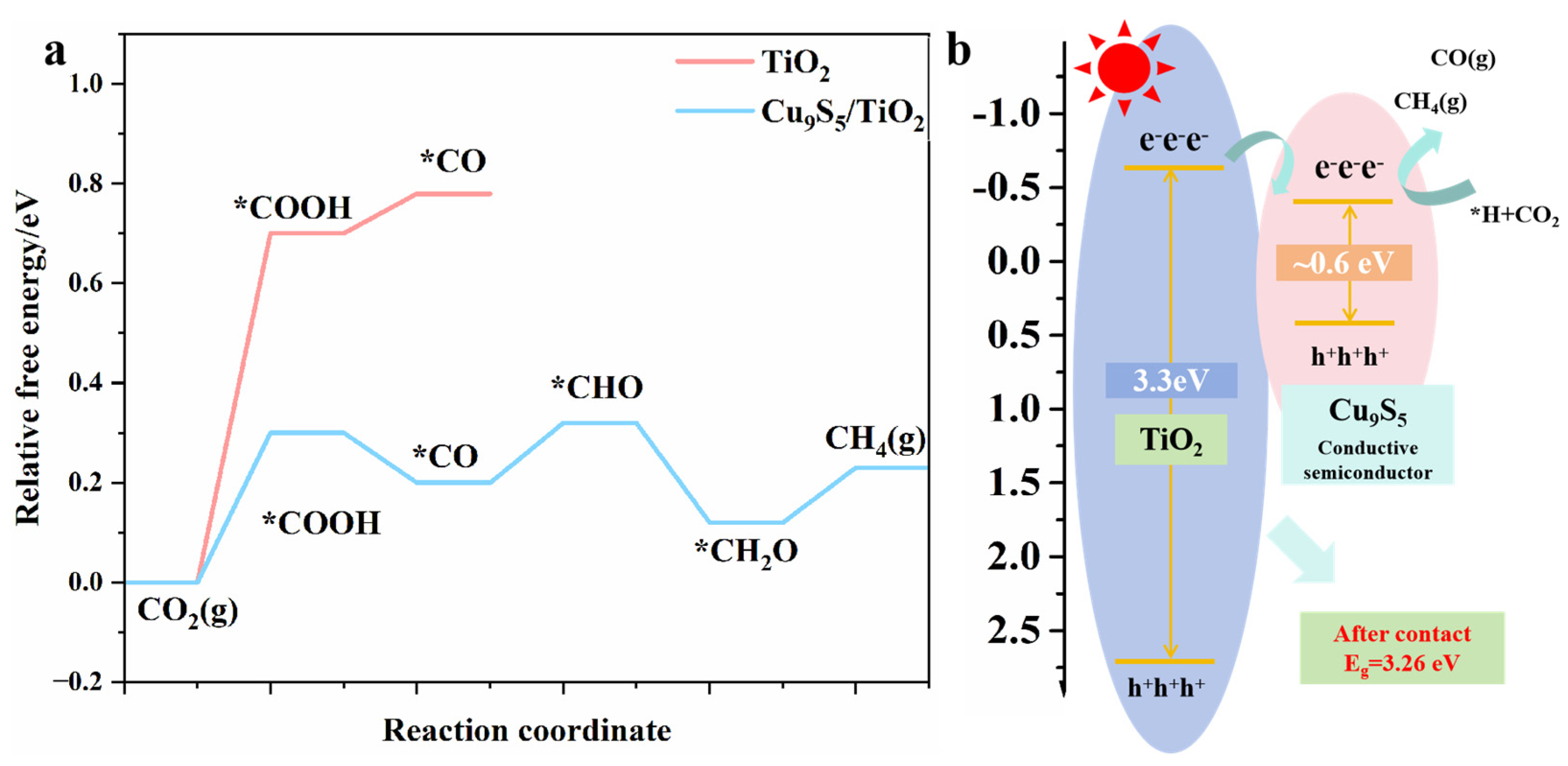 Together, these results demonstrate that the Cu9S5/TiO2 composite not only facilitates the efficient formation of key intermediates such as CO and CHO but also significantly lowers the energy barriers for CH4 production. This makes Cu9S5/TiO2 a superior photocatalyst for CO2 reduction, especially for selective methane production. The strong adsorption of CO and CHO, coupled with the improved electronic structure, is crucial for its enhanced photocatalytic activity.