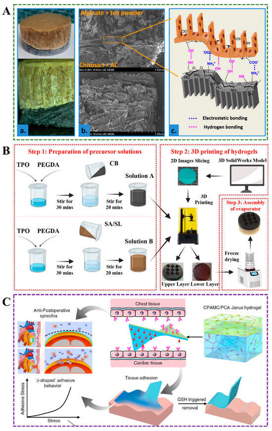 (A) The bi-layer Janus hydrogel is composed of a chitosan/activated carbon layer and an alginate/tea powder layer []. (B) Diagram of preparation of double-layer Janus hydrogel. TPO: diphenyl (2,4,6-trimethylbenzoyl)phosphine oxide []. (C) Structure and application of the CPAMC/PCA double-layer hydrogel [].