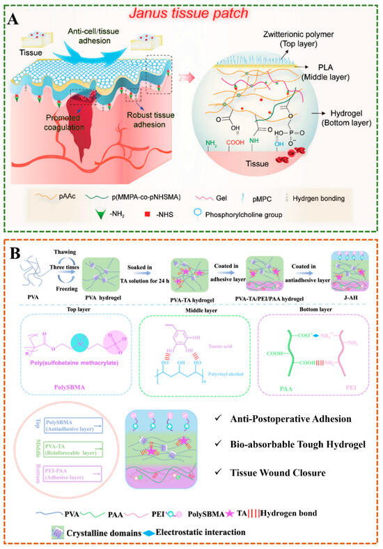 (A) The multilayer Janus hydrogel consists of a zwitterionic polymer coating, a PLA skeleton, and a hydrogel substrate for postoperative anti-adhesion []. (B) Diagram of the synthetic strategy for the three layers of Janus hydrogel [].