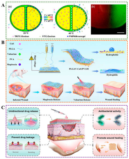 (A) In two-compartment capsules, the release rate of TRITC-dextran remained constant in one chamber, and the release rate of FITC-dextran in the other chamber changed with temperature []. (B) In the early stage, hydrophilic antibacterial drugs (mupirocin) were slowly released in the hydrophilic layer of Janus hydrogel, and, in the later stage, the photothermal effect accelerated the release of anti-inflammatory drugs (valsartan) in the hydrophobic layer, achieving a controllable drug release system during the wound healing process []. (C) Janus hydrogel delivers the drug from the outside to the wound site in a unidirectional, preventing drug leakage [].